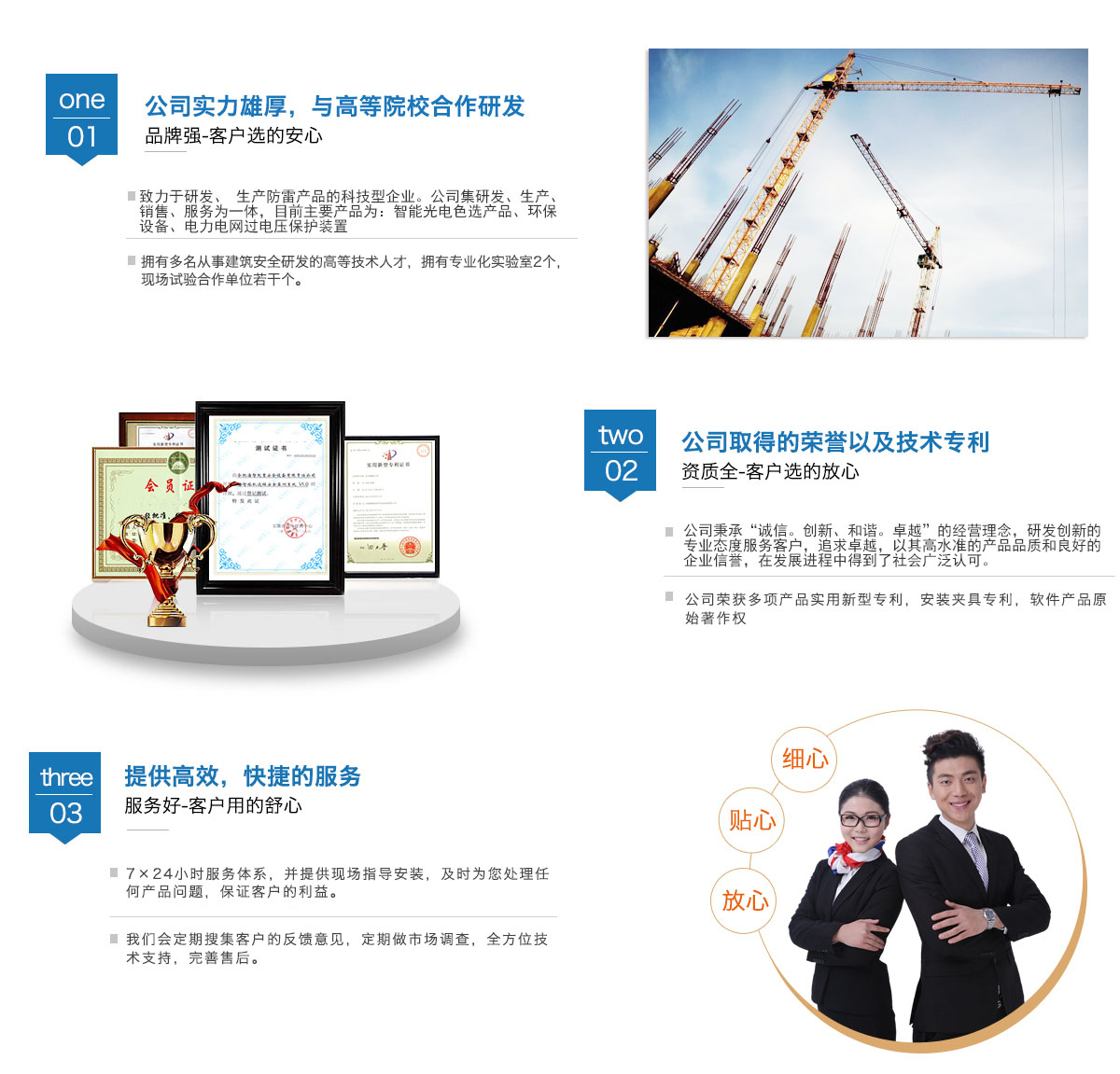 南京通和電氣科技有限公司是致力于研發(fā)、 生產(chǎn)防雷產(chǎn)品的科技型企業(yè)。公司集研發(fā)、生產(chǎn)、銷(xiāo)售、服務(wù)為一體,目前主要產(chǎn)品為:智能光電色選產(chǎn)品、環(huán)保設(shè)備、電力電網(wǎng)過(guò)電壓保護(hù)裝置。電力成套設(shè)備。光電產(chǎn)品、電力監(jiān)測(cè)設(shè)備等。公司秉承“誠(chéng)信。創(chuàng)新、和諧。卓越”的經(jīng)營(yíng)理念,研發(fā)創(chuàng)新的專(zhuān)業(yè)態(tài)度服務(wù)客戶(hù),追求卓越,以其高水準(zhǔn)的產(chǎn)品品質(zhì)和良好的企業(yè)信譽(yù),在發(fā)展進(jìn)程中得到了社會(huì)廣泛認(rèn)可。
